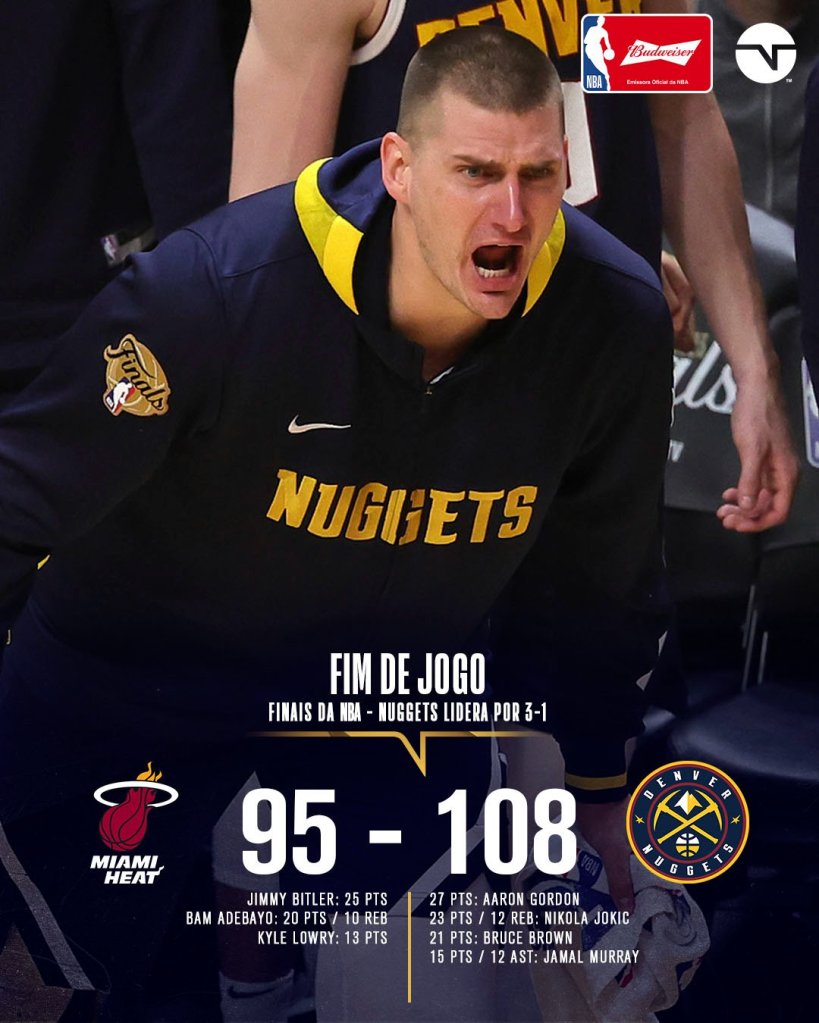 Jogando em casa até parecia que o Miami Heat ia fazer alguma coisa, porém o Denver Nuggets não deu a mínima chance! Desde os primeiros minutos, à frente do marcador, e com um controle do jogo absurdo, com o coletivo berrando forte para manter-se sempre à frente, até mesmo quando Jokic precisou ficar no banco por quase todo o quarto período.