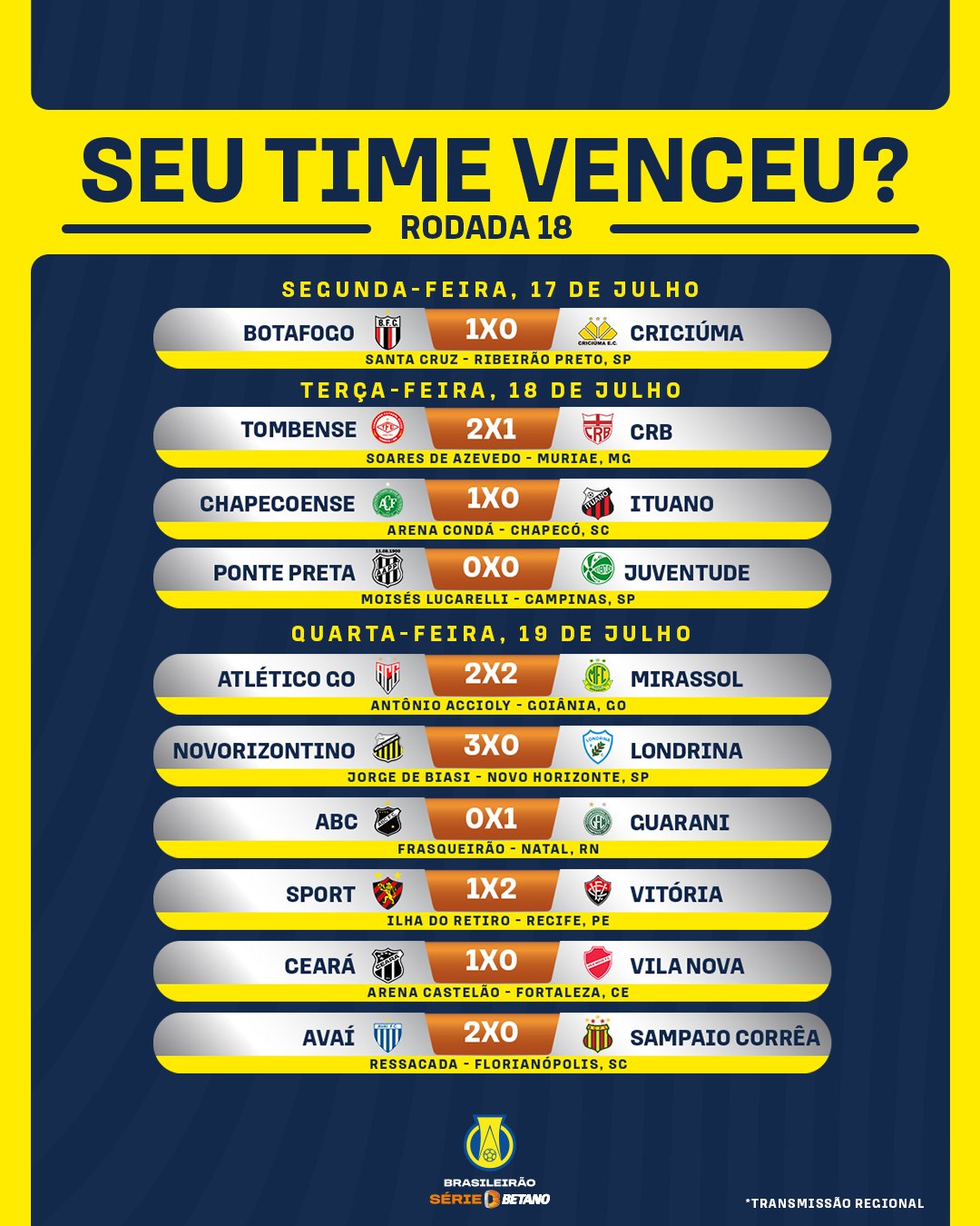 A Segundona segue imprevisível e pegando fogo! Na disputa pelo acesso, tudo embolou! Vila Nova, Criciúma e Sport perderam (pior para o Leão que saiu do G4), enquanto o Novorizontino goleou (usou só o primeiro tempo) e o Vitória, fora de casa, venceu o clássico com o Sport, e assumiu a liderança do torneio. Mirassol viu a vitória escapar no último minuto, e a chance de colar no G4. Ceará e Botafogo de Ribeirão Preto venceram e diminuíram a distância do pelotão do acesso, como também o Guarani, que fora de casa, superou o ABC e começa a ver o G-4 apenas à 4 pontos. Juventude empatou com a Ponte Preta fora e ambas equipes seguem na meiuca, apesar do Juventude olhar pra cima, e a Ponte para baixo. Tombense e Chapecoense venceram e seguem lutando ponto-a-ponto contra a degola. Avaí também voltou a vencer e deixou a lanterna (mas segue no buraco). Falta uma rodada para acabar o turno e a Série B está toda louca!