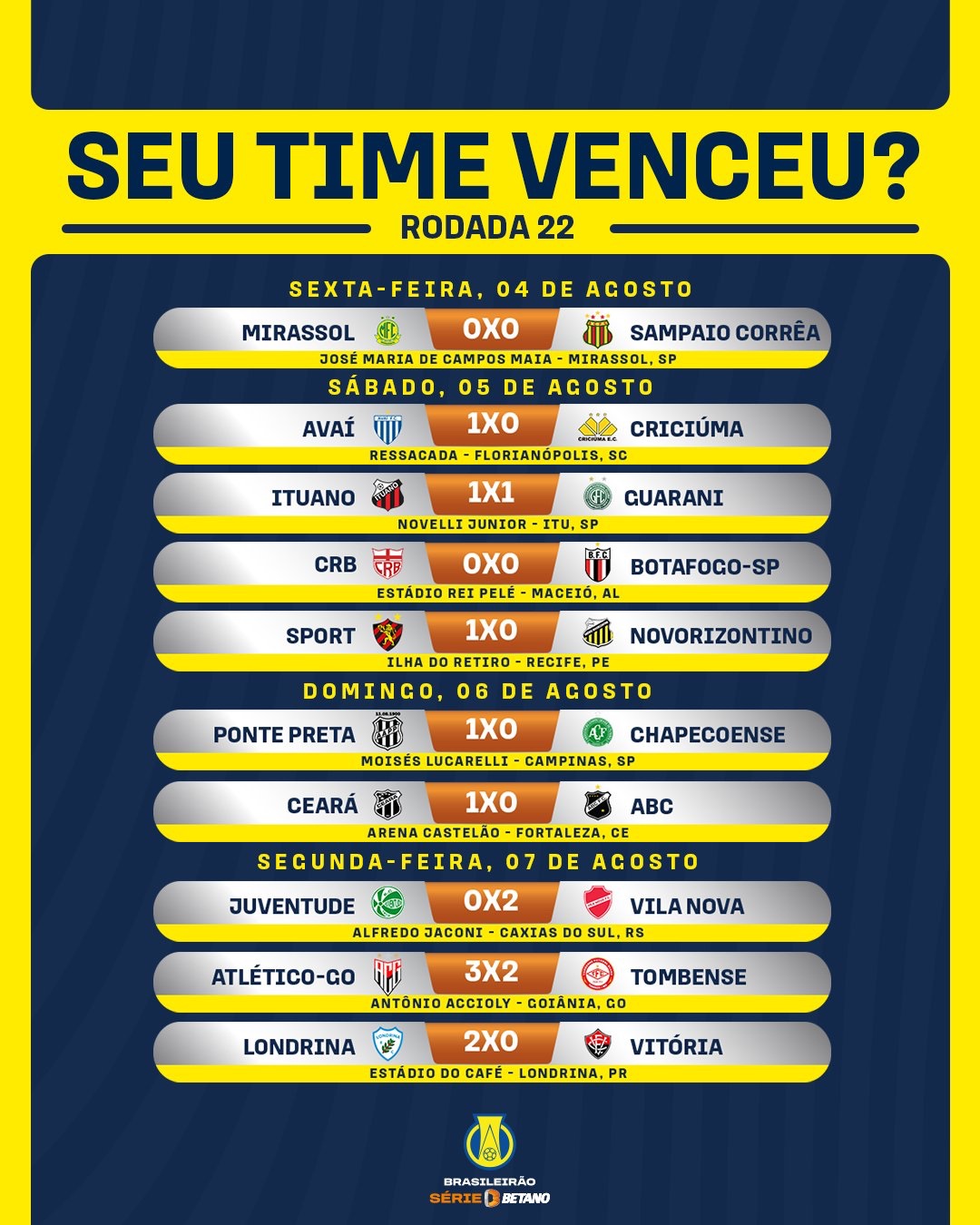 Na segunda (7), o Vila Nova saiu da crise, retornando ao G4 após bater o Juventude, concorrente direto, em Caxias do Sul. Em Goiânia, Gustavo Coutinho marcou 3 vezes e garantiu a vitória do Atlético Goianiense e o Z4 da Tombense. No estádio do Café, o Londrina esqueceu que era penúltimo e bateu com autoridade o ex-líder Vitória.
