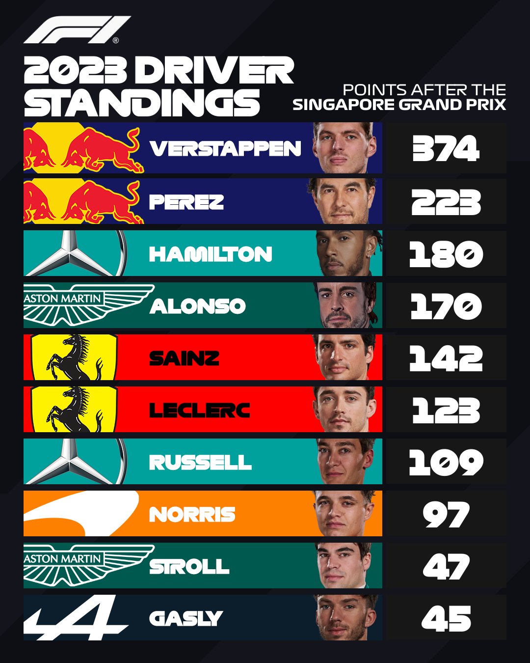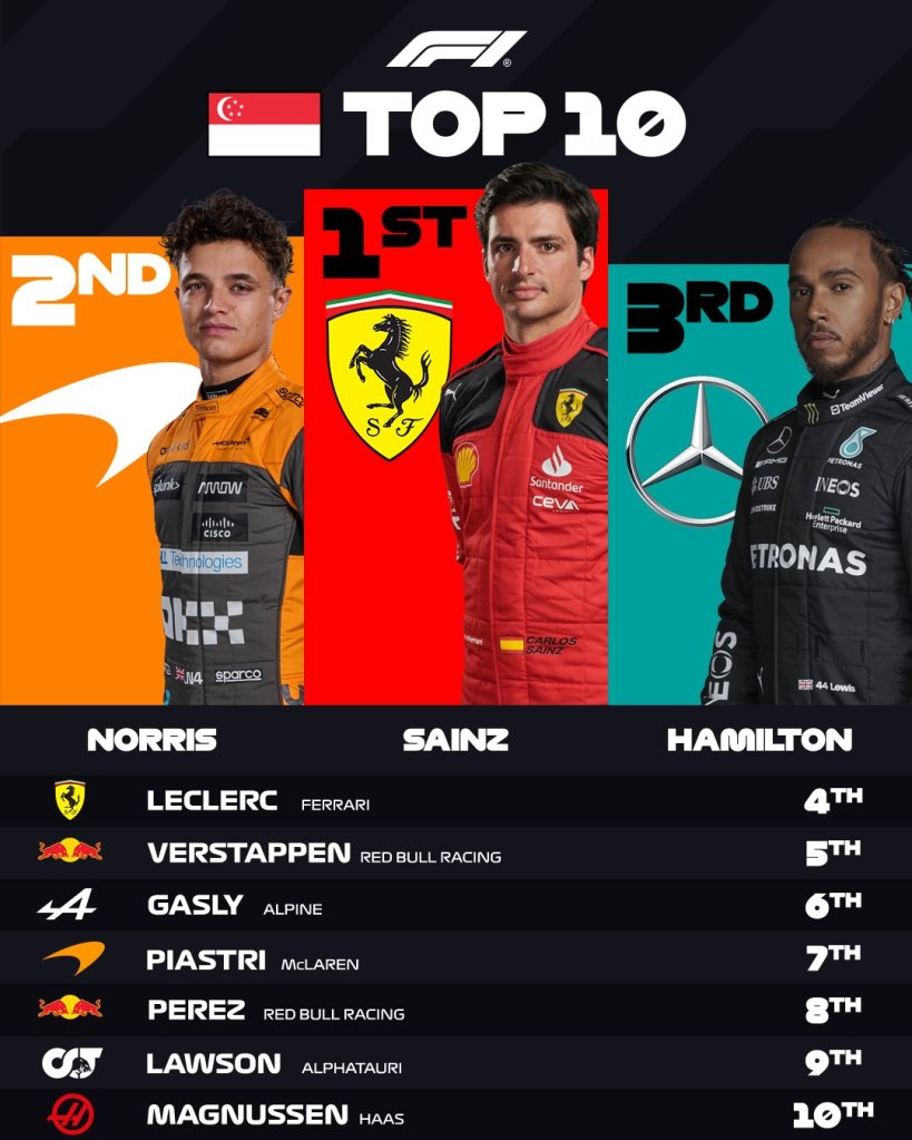 Na melhor corrida do ano, a inteligência de Carlos Sainz lhe garantiu a primeira vitória da Ferrari em 2023. Em um GP, aonde a disputa por posições foi o grande destaque. Chegamos na última volta com 4 carros podendo vencer a prova. Sainz, Norris, Russell e Hamilton estavam separados por poucos segundos. Sainz segurou Norris por várias voltas em uma distância inferior à 1 segundo, o que fez o piloto da McLaren segurar os dois da Mercedes que vinham de pneu novos, devido ao uso do DRS. Sainz esbanjou inteligência estratégica para ser o vencedor da prova asiática. Verstappen, que vinha de 10 vitórias seguidas, sabe que o tricampeonato é questão de tempo, porém, com certeza, o jejum em Singapura deve incomodar o holandês, que fez sua pior corrida no ano, e assim, conquistando um 5º Lugar. Obrigado, Singapura, pela melhor prova da temporada!