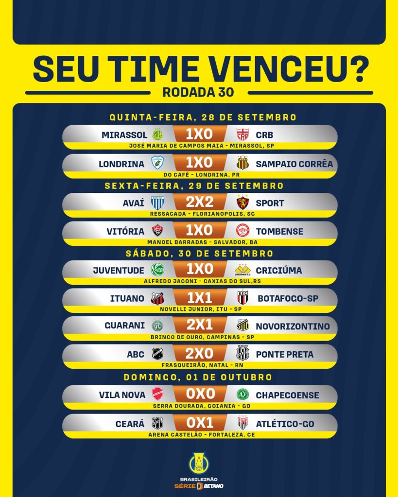No sábado (30), Ituano e Botafogo de Ribeirão Preto fizeram um empate até animado, porém um resultado ruim para ambos. Em Natal, o ABC fez às pazes com a vitória ao bater a Ponte Preta. A Macaca segue com risco de Z4, enquanto os potiguares, mesmo com a vitória seguem na lanterna. Nos duelos entre alviverdes e aurinegros, que valiam G4, deu tudo certo para quem era verde. Juventude e Guarani venceram Criciúma e Novorizontino, e fecharam a rodada entre os que subiriam.