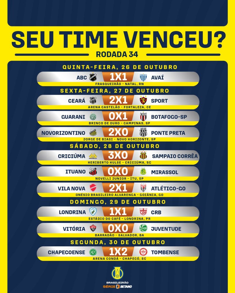 Na Sexta-Feira (27), o Sport manteve a carteirinha de freguês do Ceará intacta. O Vozão, mesmo já pensando em 2024, superou o rival e, matematicamente, confirmou sua presença na Segundona 2024, já o Leão viu sua vida na Série B deixar de ser o sossego de outrora. O time entrou no bolo. Nos outros jogos da noite, o Novorizontino bateu a Ponte Preta e quase entrou no G4, já o Guarani vacilou e viu sua entrada no G4 ser cancelada e complicada para as próximas rodadas. O Botafogo de Ribeirão, que venceu o Guarani, confirmou mais um ano de Série B, enquanto a Macaca nunca esteve tão preocupada com uma queda para Terceirona.