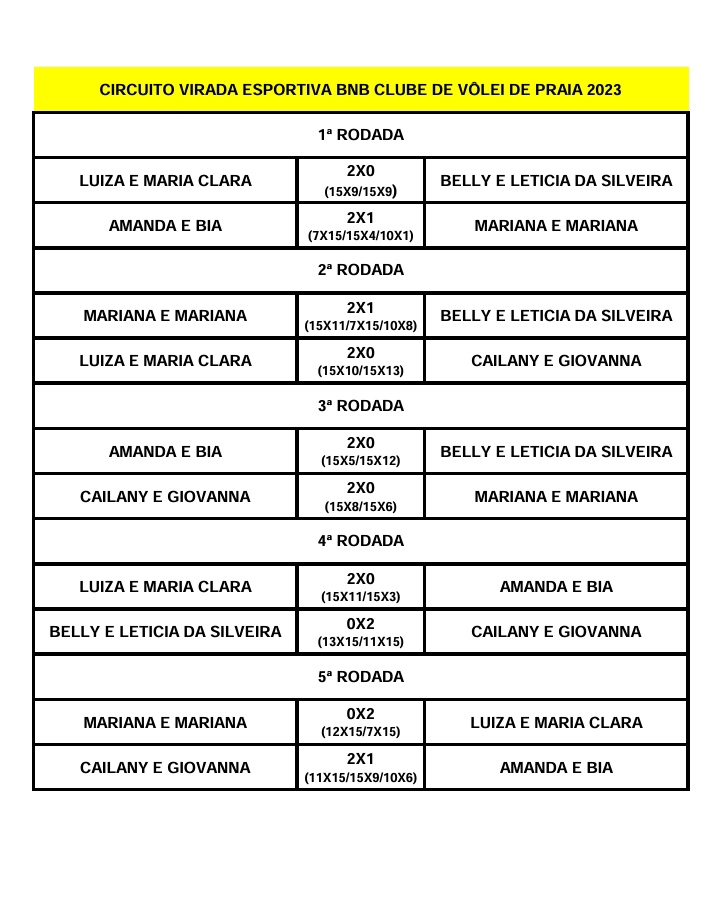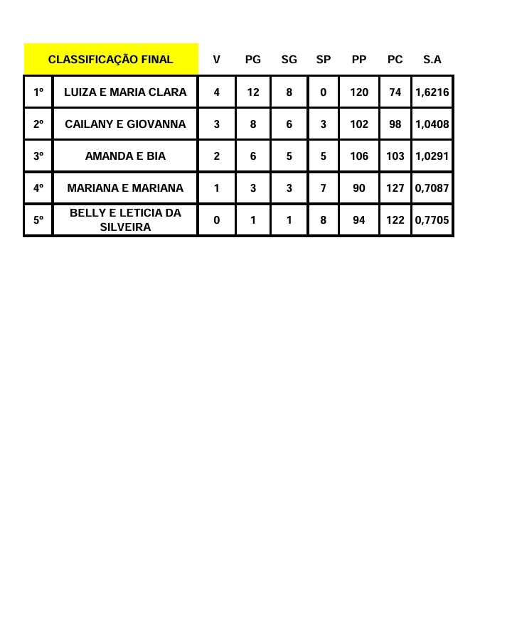 Mariana e Mariana superaram as dificuldades e a falta de entrosamento para conquistarem quarto lugar. O quinto lugar de Isabelle e Letícia da Silveira também não é nenhum problema, as meninas jogaram bastante, se esforçaram bastante, superaram o calor, e apesar, de serem as únicas que não conseguiram vencer, esbanjaram alegria e confiança para os próximos desafios.