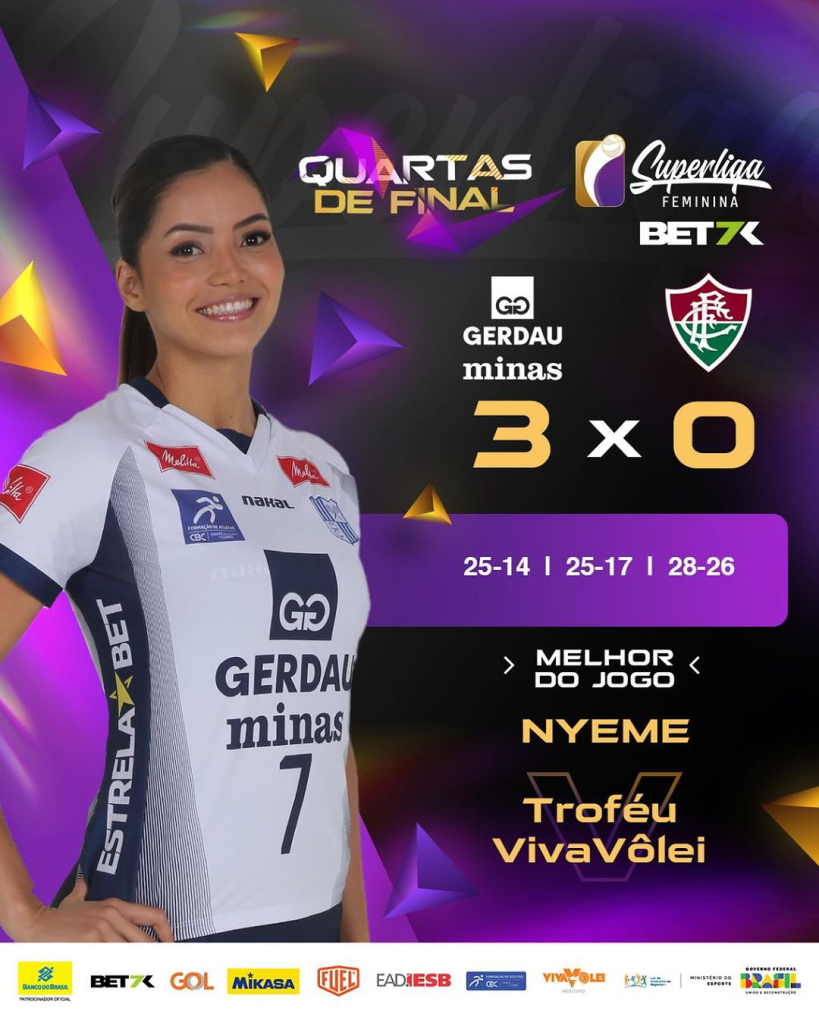 Em Belo Horizonte, o Minas teve uma vida bem mais tranquila. Diante o bom e jovem time do Fluminense, as mineiras conquistaram o 3×0 e ratificaram o favoritismo para esse primeiro jogo. Jogo quase impecável de Nyeme, parando o perigoso ataque tricolor e servindo bem o ataque das guerreiras de aço. Jogo 2 no Rio, para o Minas fechar ou o Fluminense manter o sonho de alcançar as Semifinais da Superliga.