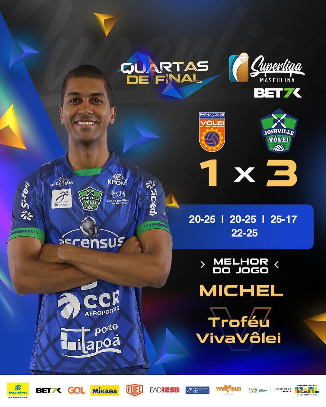 Em São José dos Campos, o Joinville estava nem aí que era seu primeiro jogo de Playoffs na elite do vôlei e que jogava na casa do atual Vice-Campeão do torneio. Com saques precisos e ataques impiedosos, os catarinenses foram incisivos, e assim garantiram o 3×1. No último set, por exemplo, viraram um 17×13 para um 25×22.