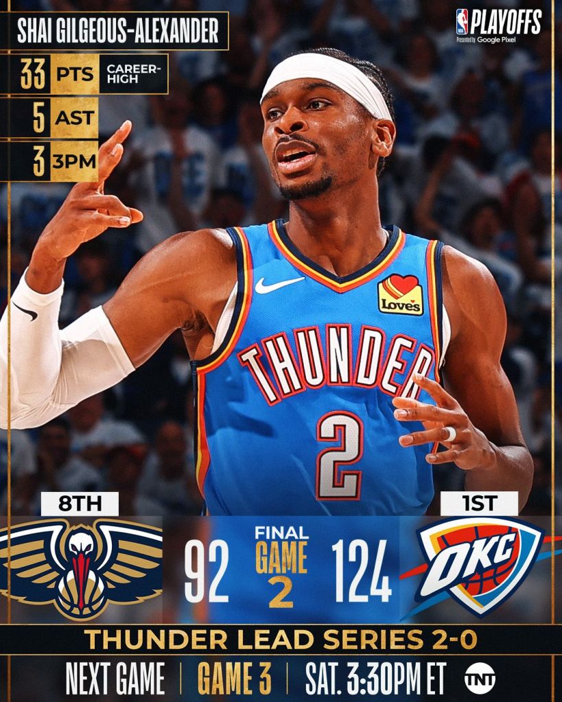 Em Oklahoma, não houve possibilidades de zebra. Vitória tranquila do Thunder sobre os Pelicans e série ampliada para 2×0.