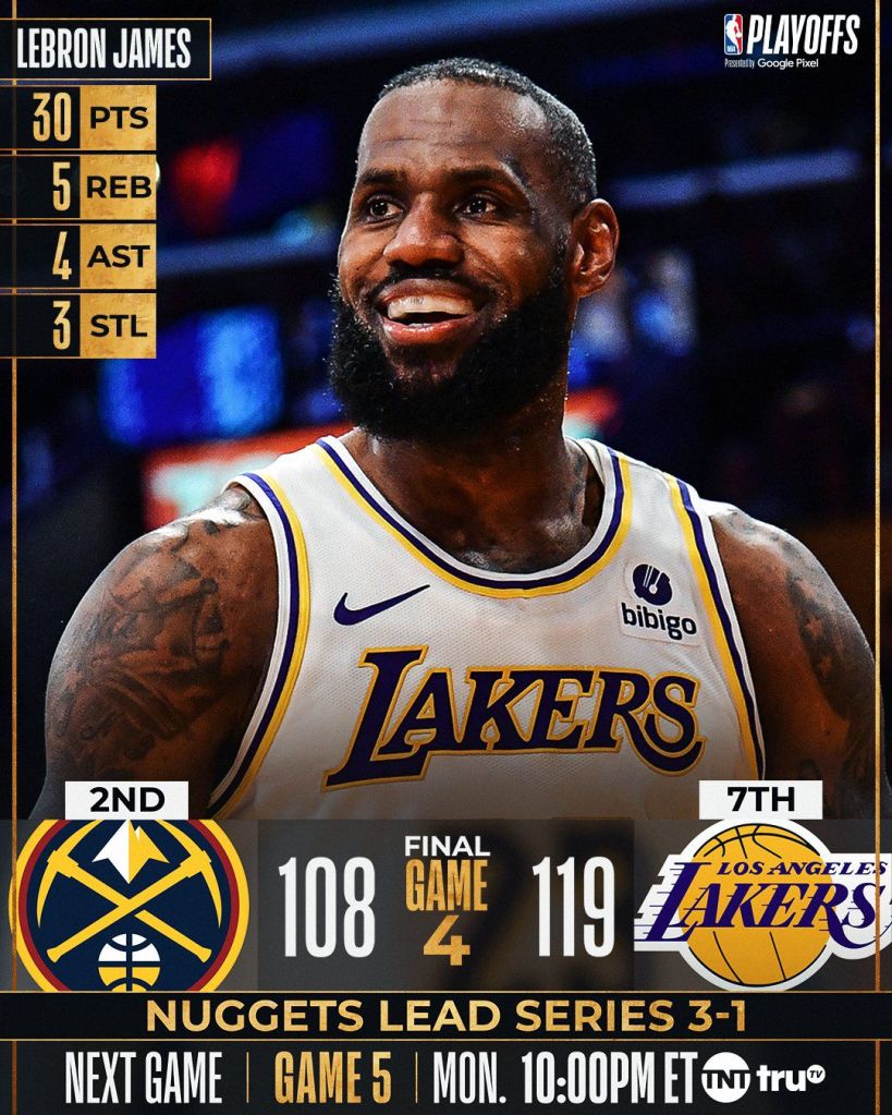 Em Los Angeles, nem o triple Double de Jokic foi capaz de garantir a varrida em prol do time do Colorado. Em grande jogo do time titular, com total protagonismo de LeBron James e Anthony Davis, os Lakers superaram os Nuggets e adiaram uma precoce eliminação. Porém a série segue 3×1 à favor dos Nuggets, que jogarão em casa no próximo jogo.