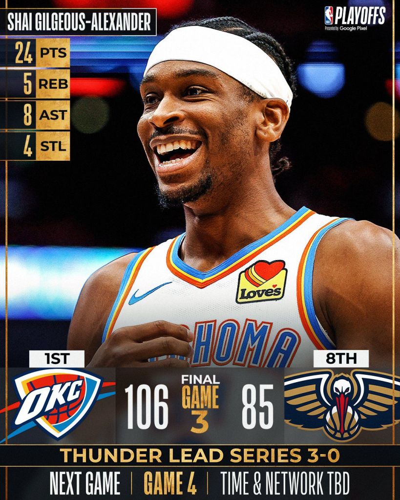 Quem não está sabendo brincar é o Thunder. O melhor time do Oeste na temporada regular aniquilou com os Pelicans em New Orleans. Outro show de Shai. 3×0 e podemos ter vassourada na próxima partida.