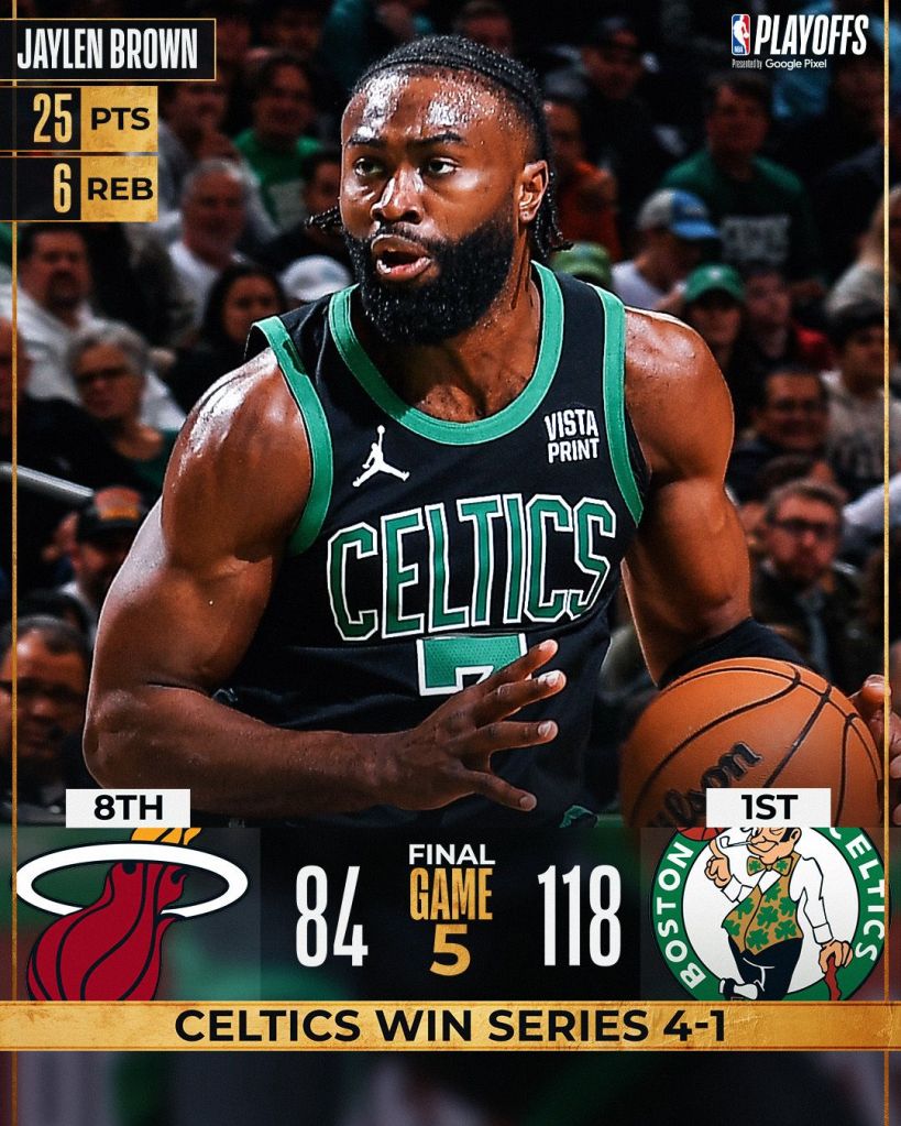 O Celtics fechou a série contra o Heat em 4×1, replicando em Boston, o que ocorreu nos dois últimos confrontos em Miami. O placar estava tão dilatado, que durante todo o último período, as equipes atuaram com os reservas. Foi uma vitória para lavar a alma e reafirmar o favoritismo do time de Verde.