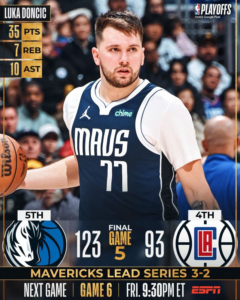 Os Mavs também desconheceram os Clippers, principalmente, no segundo tempo (terceiro e quarto período) Doncic e Irving, além de todo um sistema defensivo, acabaram com os Clippers em Los Angeles. A Série agora está 3×2 para o Dallas, que pode fechar os confrontos no Texas.
