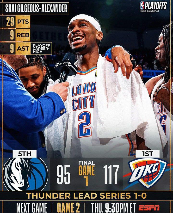 Em Oklahoma, o Thunder confirmou a fase excepcional que vive. Quinto jogo de playoff, quinta Vitória. Novamente Shai foi o cara do triunfo dos melhores do oeste. O Mavs de Doncic e Irving terá que fazer muito mais do que fez nos confrontos contra os Clippers se quiserem chegar à Grande Final.