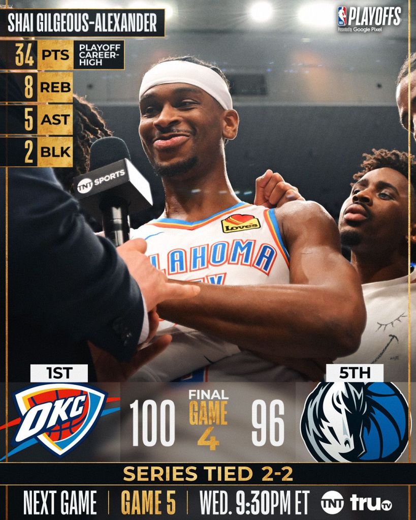 Já no Texas, o jogo duas realidades. Um primeira metade dominada pelos Mavs, com Doncic doutrinando, enquanto que a segunda metade foi toda do Thunder. Quem venceu? Quem teve o seu melhor jogador em noite inspirada, no caso, o Thunder com SGA voando baixo, fazendo sua melhor partida de Playoffs, garantindo o empate na série e fazendo o confronto seguir eletrizante.