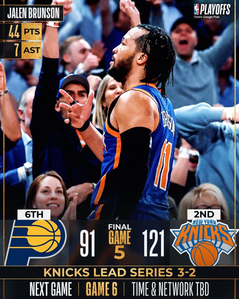 Em Nova York, os Knicks atropelaram a equipe do Pacers. Em uma atuação impecável de seu principal jogador, Jaylen Brunson. O passeio nova-iorquino colocou o time de Brunson a uma vitória da Final do Leste. A série agora volta para Indiana. Lembrando que, até agora, só os mandantes venceram nos confrontos.