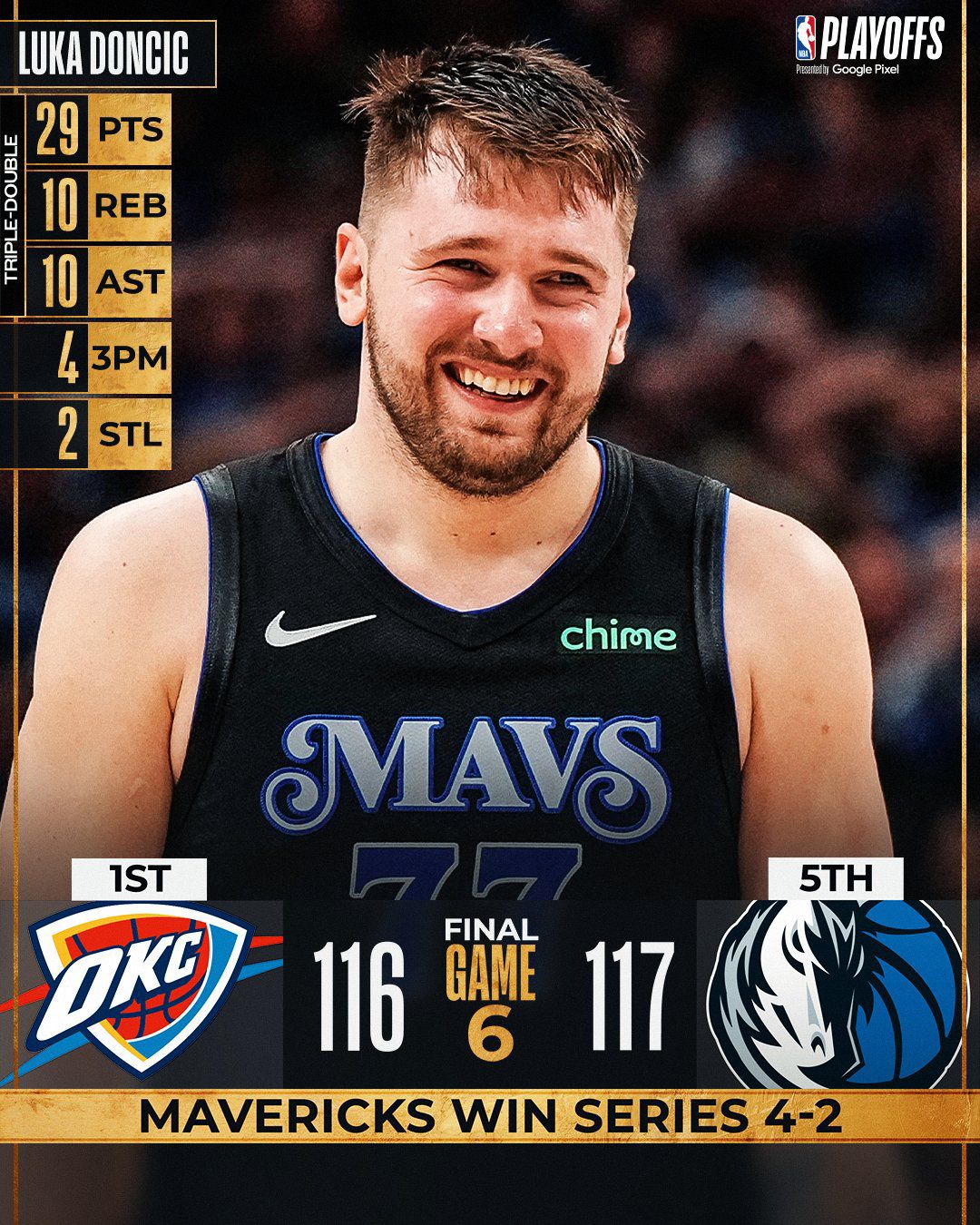 Com 77 palavras! O fortíssimo Oklahoma City Thunder de Shai chegou a está 20 pontos à frente no marcador, porém o Dallas Mavericks tinha dois monstros inspirados e um calouro com muita vontade de jogar. Ao fim, com direito à viradas e reviradas no último minuto, o triple double de Doncic contou muito para garantir a incrível vitória dos Mavs na partida e na série. O time do Texas estará na Final do Oeste! 4×2 na série!