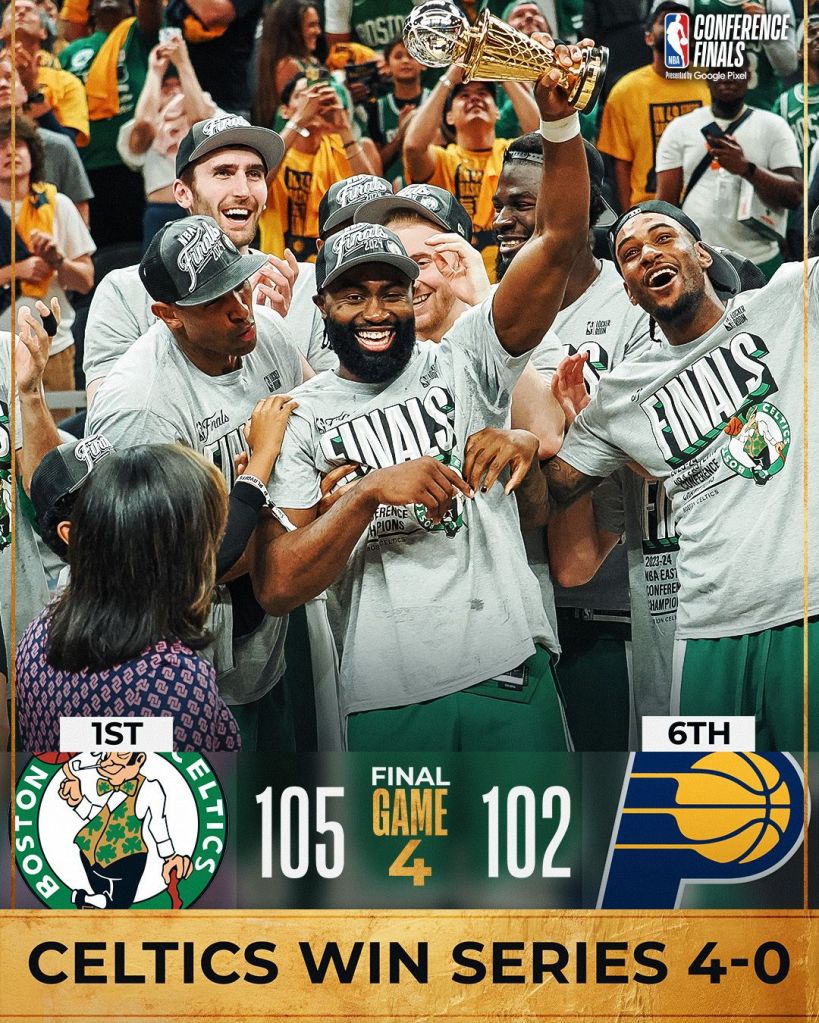 O título veio no Jogo 4 contra o Pacers em Indiana. Como ocorreu em quase todos os outros jogos, o Boston Celtics ficou atrás do marcador por quase todo o jogo. No último período, no último minuto, viu Derrick White acertar uma bola de três perfeita e Jaylen Brown evitar, no capricho, a cesta dos Pacers.