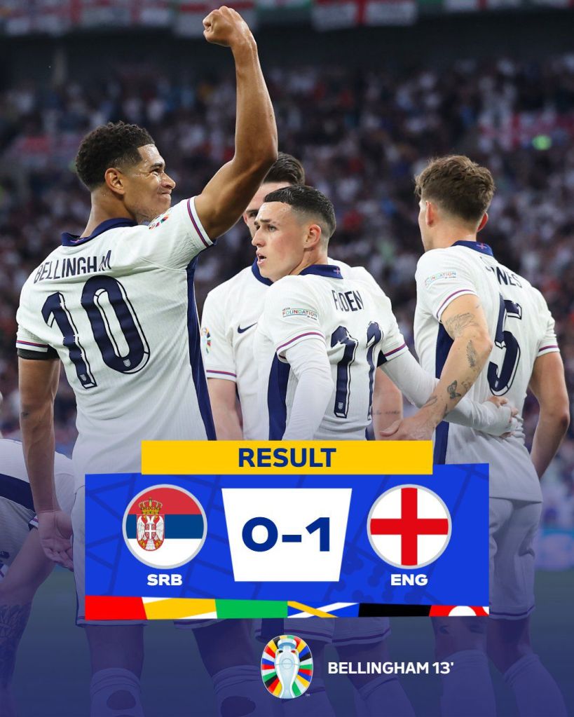 No último jogo do dia, a Inglaterra precisou de muita garra para superar a valente seleção da Sérvia. Porém quem tem Bellingham, costuma sair feliz de campo. O craque inglês garantiu a vitória dos Leões com uma bela cabeçada.
