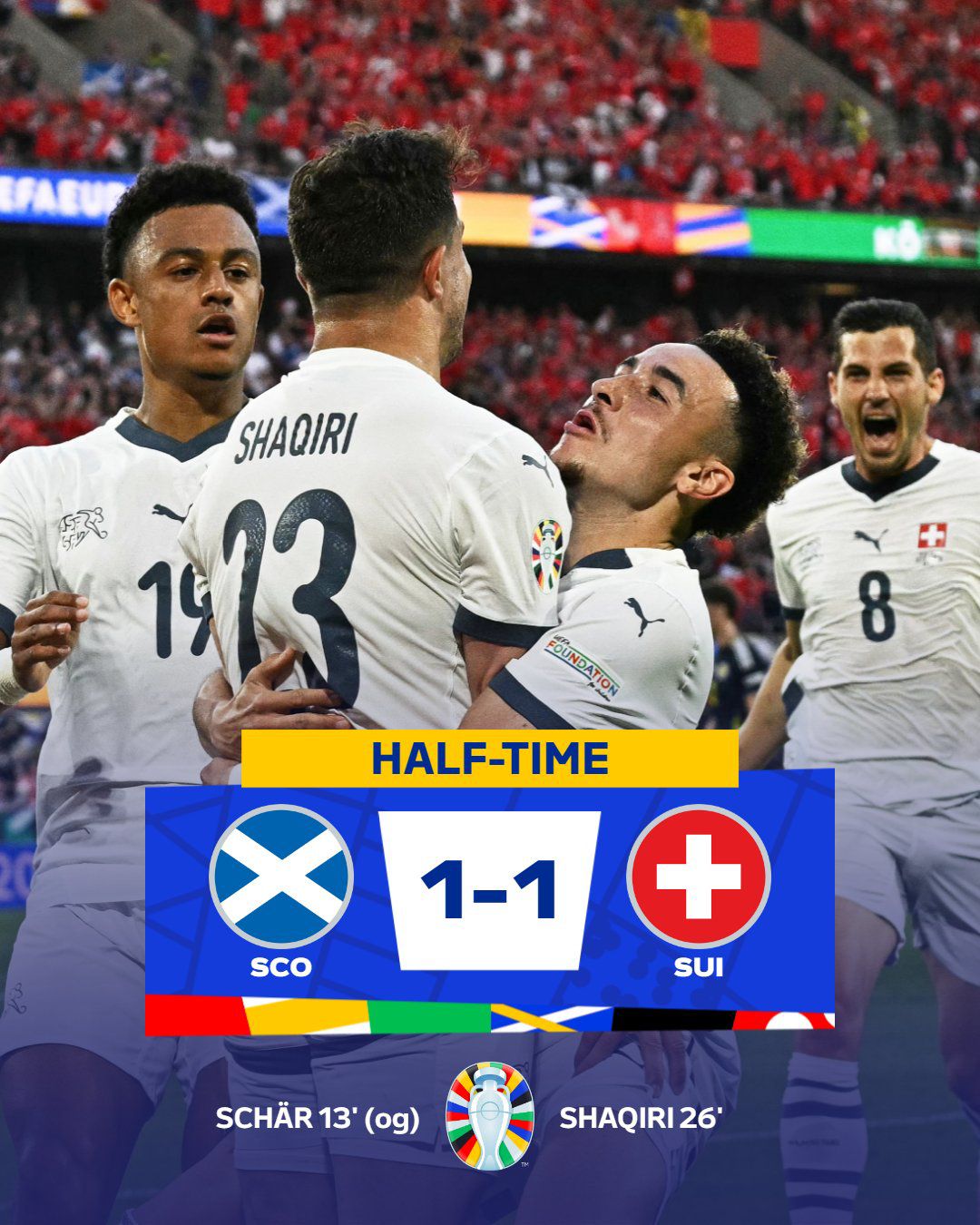 Na partida que fechou a rodada, Suíça e Escócia se entregaram em campo, tamanha entrega só tinha um caminho – o empate. Um 1×1 bom para os Suíços, que chegam à 4 pontos, enquanto os escoceses vão para o duelo contra a Hungria com uma pequena esperança de Oitavas.
