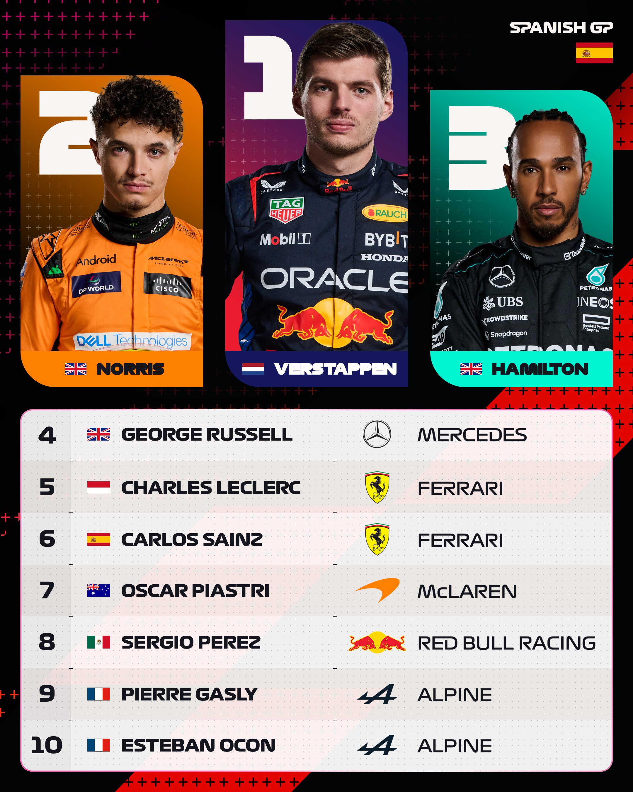 Mais uma vez deu Verstappen, com Norris em segundo e Piloto do Dia. O GP da Espanha foi animado desde a largada, quando Russell deixou Norris, que foi pole, e Verstappen para trás. Porém, pouco tempo depois, o holandês assumiria a ponta para não largar mais. Mesmo sentindo as dificuldades que o carro vem apresentando em encarar curvas rápidas, Verstappen mostrou mais uma vez que não é só um “carro bonito”, é talento puro de um tricampeão, cada vez mais perto do Tetra. Norris também começa a se impor com sua McLaren, mais um segundo lugar, e dessa vez, impondo sua McLaren sobre as Mercedes e as Ferraris na pista. Hamilton, que fez uma corrida discreta, alcançou mais uma vez o pódio. Russell que começou alucinante, teve trabalho até a última volta, entretanto impediu que LeClerc colocasse uma Ferrari no TOP 4 do GP.