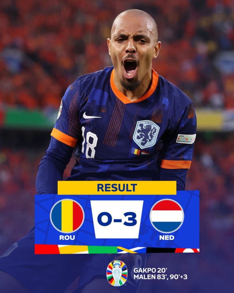 Os Países Baixos sofreram mais do que podiam esperar diante a Romênia. A Laranja Mecânica viu Malen sair do banco na reta final, marcar 2 vezes e tranquilizar a torcida neerlandesa, que estava tensa, mesmo com o placar à frente desde os 20 minutos do primeiro tempo, quando Gakpo deixou o dele. Os gols perdidos davam um medo de não ser o dia dos Países Baixos, porém foi sim. A Romênia, que jogou muito na 1ª Rodada, deu um adeus feliz, pois voltou a figurar em uma partida eliminatória de Euro.