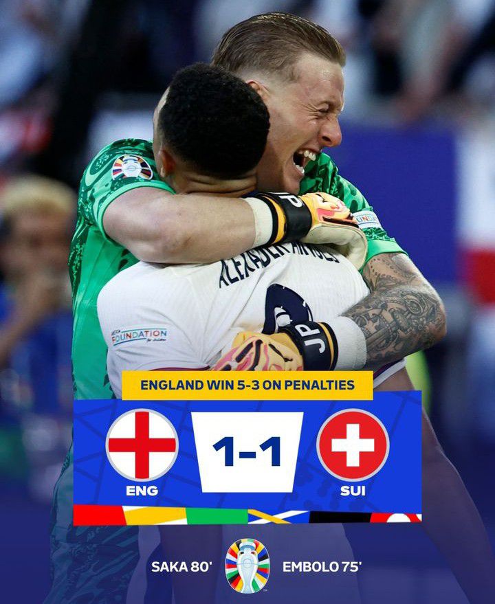 De novo… Ufa! Foi nos pênaltis, mas a Inglaterra avançou e está nas semifinais da Euro. Embolo deu um susto no torcedor inglês quando abriu o placar da partida já na segunda metade do segundo tempo, mas a Inglaterra tem Saka, que empatou a partida com um golaço. O jogo não se resolveu na prorrogação, foi parar nos pênaltis, aonde Pickford catou apenas uma cobrança, o que foi suficiente, já que os ingleses não erraram nenhuma. 5×3 e a Inglaterra está novamente no Top 4 da Europa.
