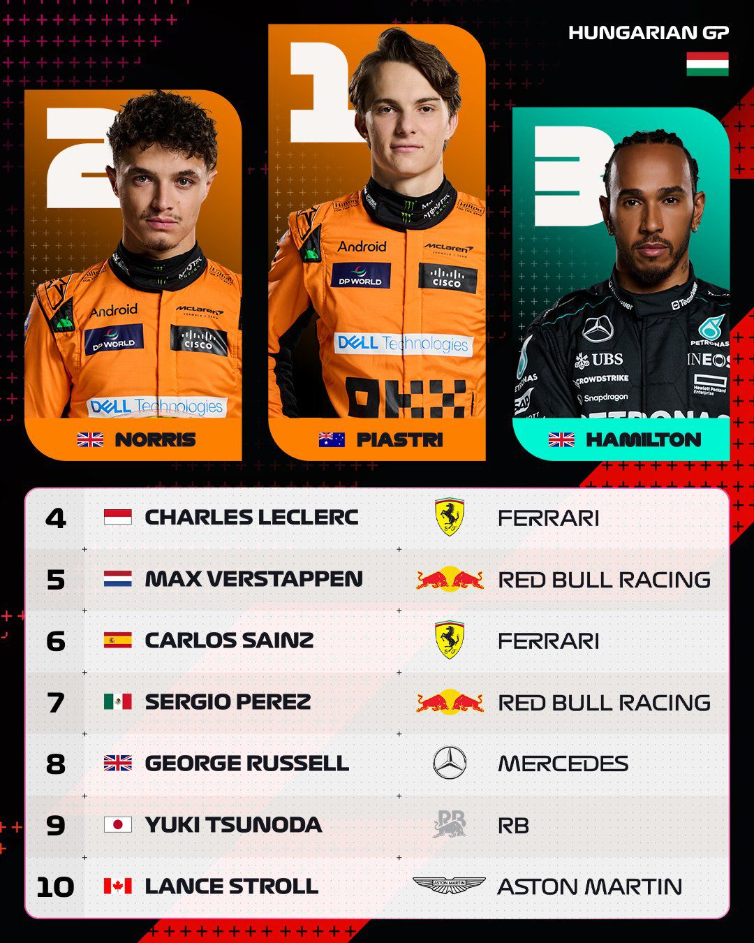 Tivemos a treta da McLaren, exigindo que Norris devolvesse a posição para Piastri, visto que o piloto australiano liderou toda a corrida e só teve o Pit stop postergado, para evitar que Hamilton aproximasse de Norris. “Landinho” não quis devolver, mas por fim, devolveu no melhor estilo Rubinho. Em meio às polêmicas, Piastri conquistou sua primeira vitória em uma corrida oficial (ele já havia ganho uma Sprint).