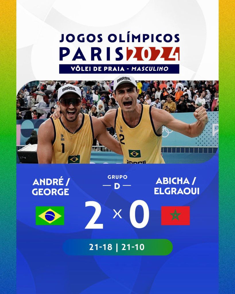 Contra os marroquinos, Abicha e Elgraoui, Jorge André tiveram dificuldade, especialmente, no primeiro set, ganhando no limite da vantagem. Já no segundo set, a dupla brasileira conseguiu controlar o jogo por completo.