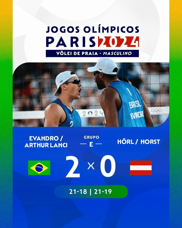 Em dois sets bastante disputados, Evandro e Arthur Lanci superaram os austríacos Hoerl e Horst por 2×0 e garantiram o 100% das duplas brasileiras em Paris, nesta 1ª Rodada dos jogos Olímpicos.