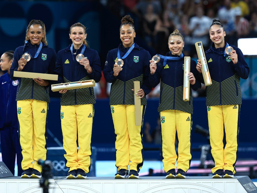 Histórico! Inesquecível! O time formado por Rebeca Andrade, Flávia Saraiva, Julia Soares, Lorraine Oliveira e Jade Barbosa conquistaram a primeira medalha Olímpica por Equipe da História da Ginástica Artística Brasileira. As meninas somaram 164.497 pontos, conquistando o tão sonhado bronze, e isso, ficando apenas 0,234 pontos à frente da Grã-Bretanha, quarta colocada.