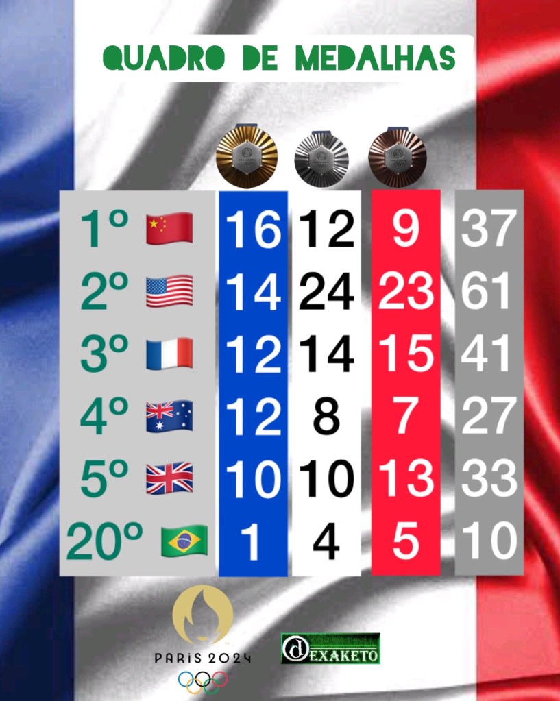 A China segue na liderança, porém os EUA, finalmente, apareceu. Com as 3 medalhas no dia, o Brasil continuou no Top 20 e alcançou a marca de 10 medalhas.