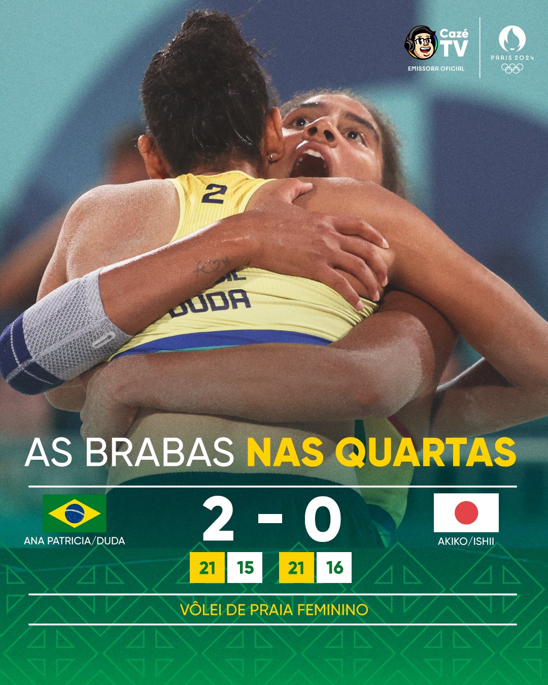 Mais uma vitória para Duda e Ana Patrícia na Arena Torre Eiffel. A dupla do Praia Clube superou as japonesas Akiko e Ishii por 2×0, em uma partida de controle absoluto do marcador, em ambos os sets. Próximo duelo será valendo um lugar na briga por medalhas contra as letãs, Tina e Anastasija.