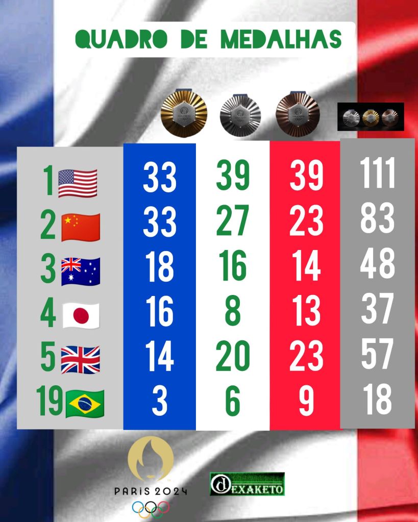 Brasil garante 1 ouro, 1 prata e 1 bronze, e se mantém no Top 20. EUA e China seguem brigando medalha à medalha pela liderança. Top 5 tem o retorno do Japão e a saída da França por um bronze, em comparação com a Grã-Bretanha.