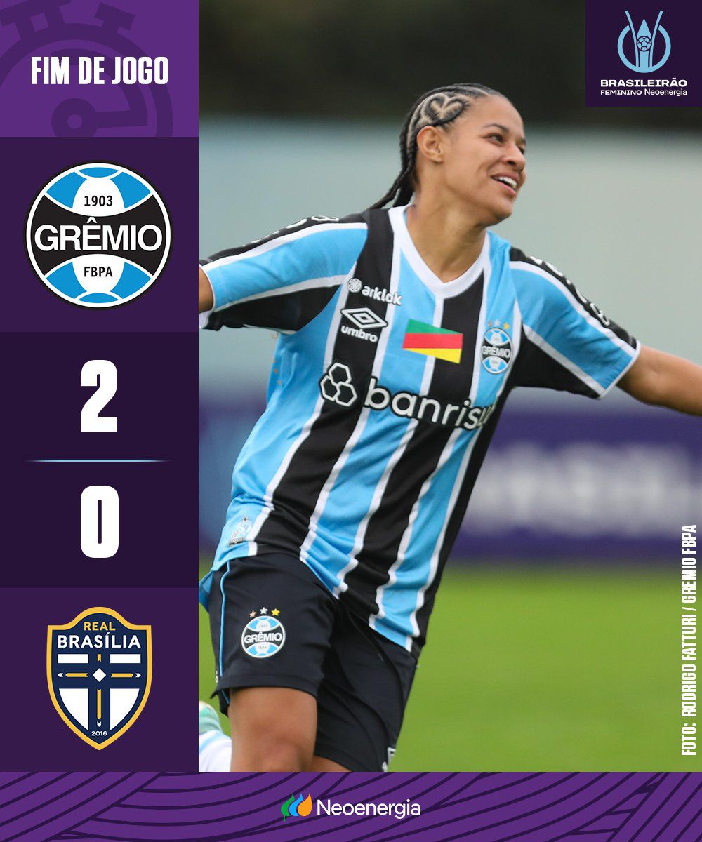 No Rio Grande do Sul, o Grêmio venceu o Real Brasília, com os gols de Cássia e Giovaninha, e também se garantiu nas quartas do Femininão. O resultado foi ruim para a equipe de capital federal, que não tem mais chances de classificação.