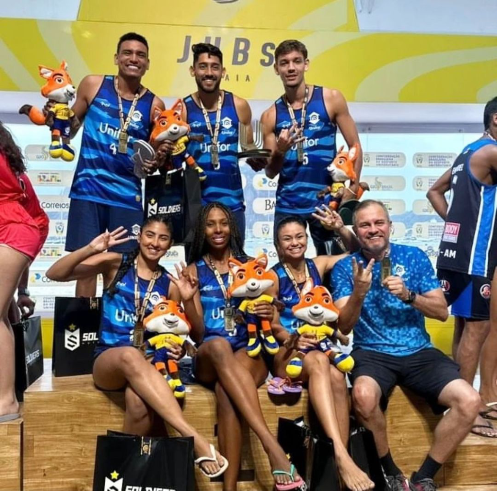 Com uma campanha perfeita, o time da Unifor se consagrou mais uma vez campeão nacional no Vôlei de Praia. Com o time formado por: Kyce, Dudinha, Rebecca, Liandro, Davi e Diego, a UNIFOR foi campeã invicta no torneio de Vôlei de Praia Misto 4 x 4 no JUB’s (Jogos Universitários Brasileiro), conquistando pelo terceiro ano consecutivo o status de melhor equipe do país. Na grande final, vitória por 2 x 0 diante a equipe da UNICESUMAR, do Mato Grosso do Sul. Parabéns, pessoal! Que se deixe a observação: Isso não é um time, é a síntese perfeita da palavra apelação!