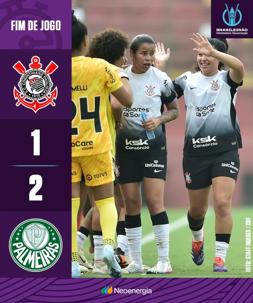 No Canindé, o Corinthians vinha com uma ótima vantagem do duelo de ida, mas a equipe do Palmeiras foi guerreira. As palestrinas saíram de campo com a Vitória, por 2 a 1, e lutaram até o último instante para reverterem a vantagem das brabas, mas não deu. O Corinthians garantiu sua oitava final consecutiva nos minutos finais da partida de ida e no golaço de Duda Sampaio hoje. As palestrinas se despedem de cabeça erguida, caindo para as favoritas, mas sem desistir do jogo em nenhum momento.