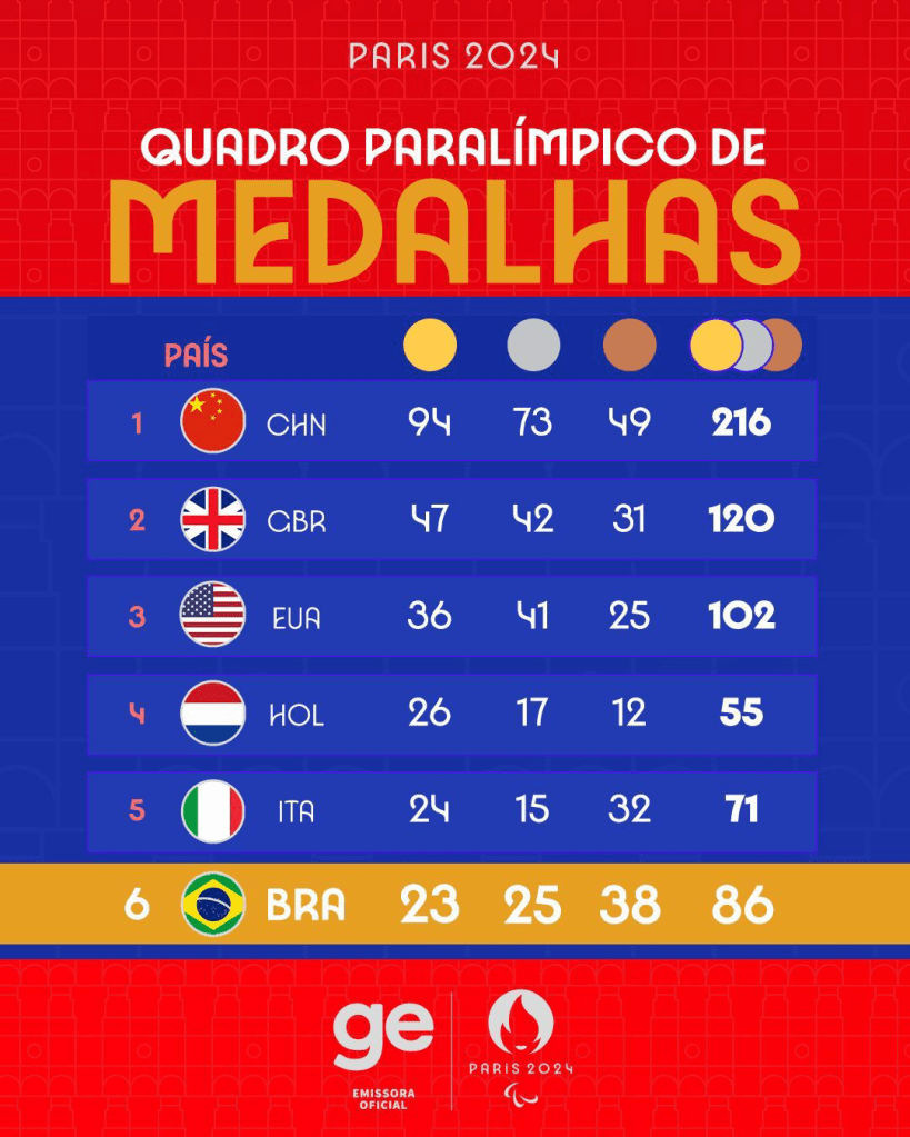Recorde! O Brasil conquistou, neste sábado (7), exatamente no seu aniversário de 202 anos, o recorde no número de medalhas conquistadas em um único dia de Paralimpíadas. Foram um total de 16, sendo seis de ouro! Com tanta medalhas conquistadas, o Brasil também superou o seu recorde total de medalhas, já alcançando a marca de 86 medalhas!