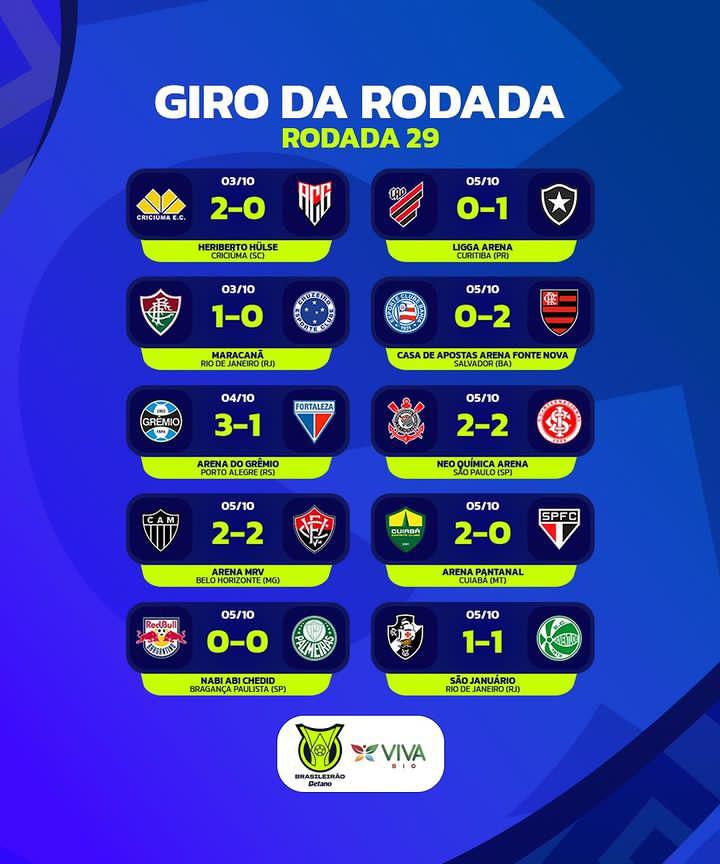 Botafogo segue líder; Palmeiras e Fortaleza derrapam em partidas como visitantes; Flamengo segue vivo na luta pelo título; Internacional segue em onda invicta e mantém Corinthians no Z4; Fluminense vence com Arias e sai do Z4; Vitória arranca empate heroico com o Atlético Mineiro, mas volta para o Z4; Grêmio e Criciúma vencem e respiram; Brasileirão segue embolado.