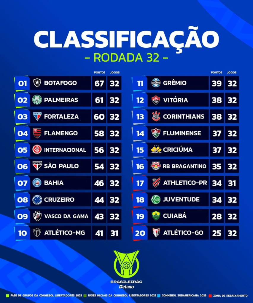 Já o Verdão, em uma exibição desastrosa, perdeu o clássico para o Corinthians e foi o único do G6 à não vencer na rodada.