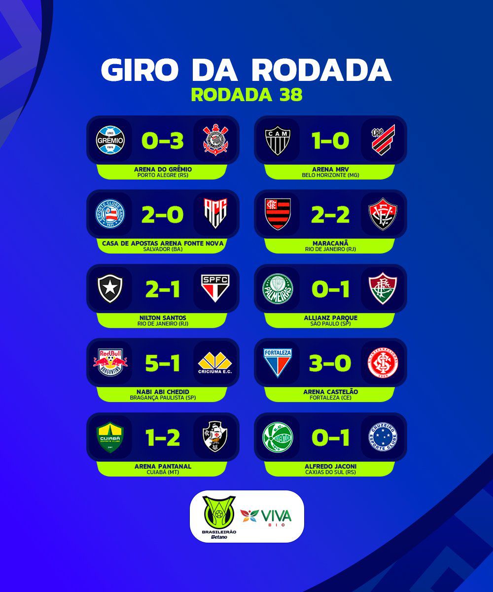 Na Arena do Grêmio, o Corinthians amassou o Grêmio e alcançou a 9ª vitória consecutiva no Brasileirão. O time do artilheiro Yuri Alberto vai para Libertadores, já os “Viúvos de Suarez” vão para Sudamericana. O jogo marcou a despedida de Geromel, não só do Grêmio, como do Futebol.