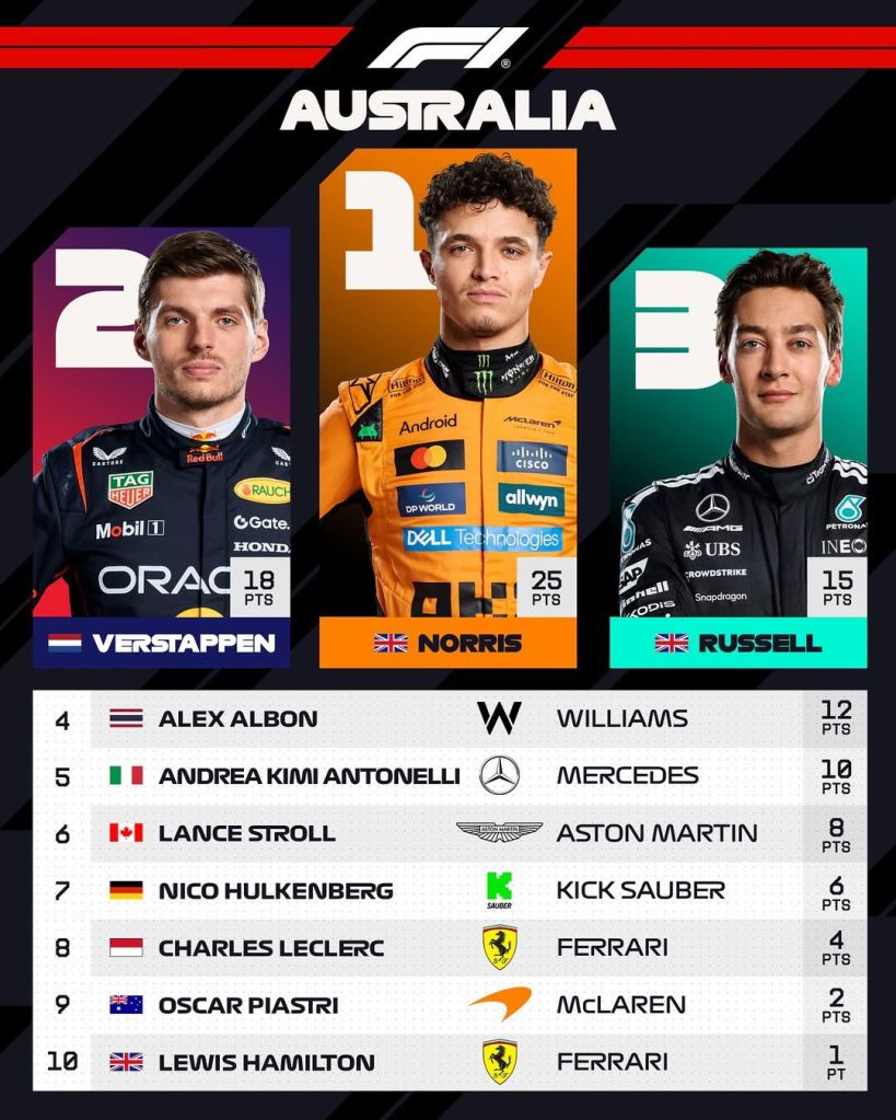 Num GP, em que quase todos os estreantes rodaram e saíram da prova, Kimi Antonelli, conseguiu chegar em 4º, sendo o melhor entre os vários novatos. Chegou a ser punido e ficar em quinto, mas depois a FIA anulou a punição e ele terminou em um incrível 4º Lugar em sua primeira corrida de Fórmula 1 com apenas 18 anos.