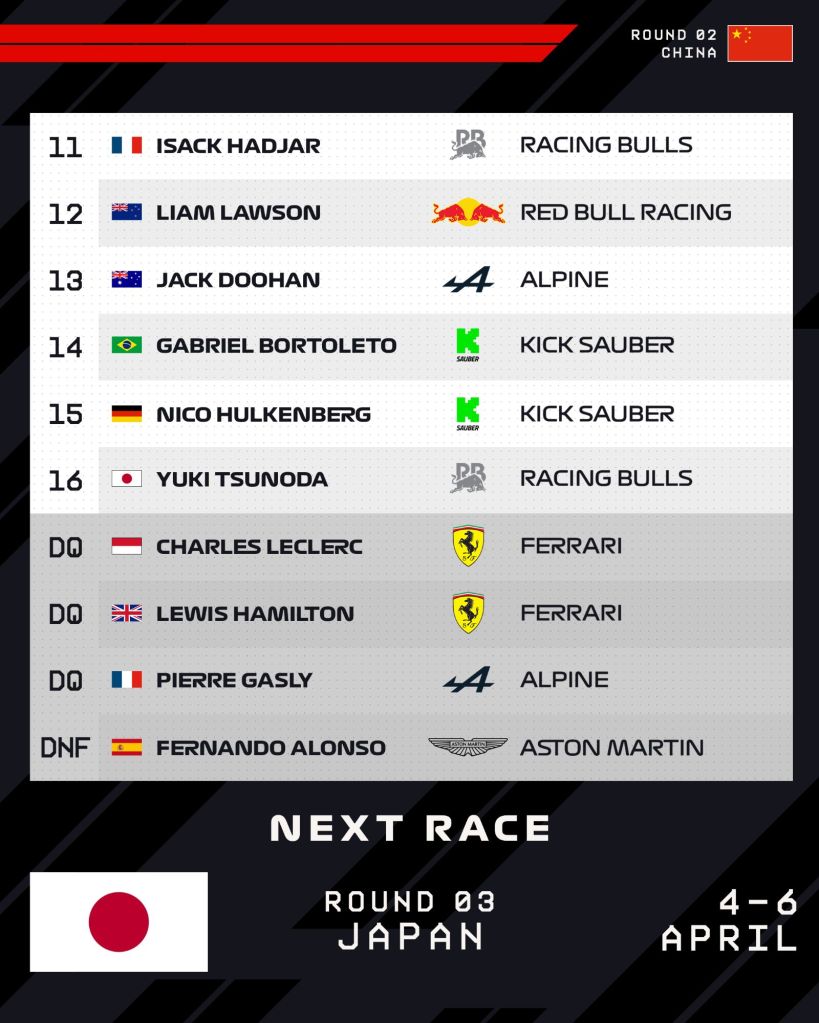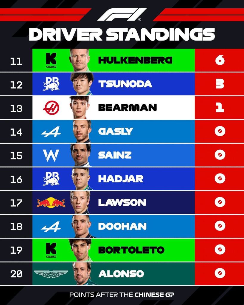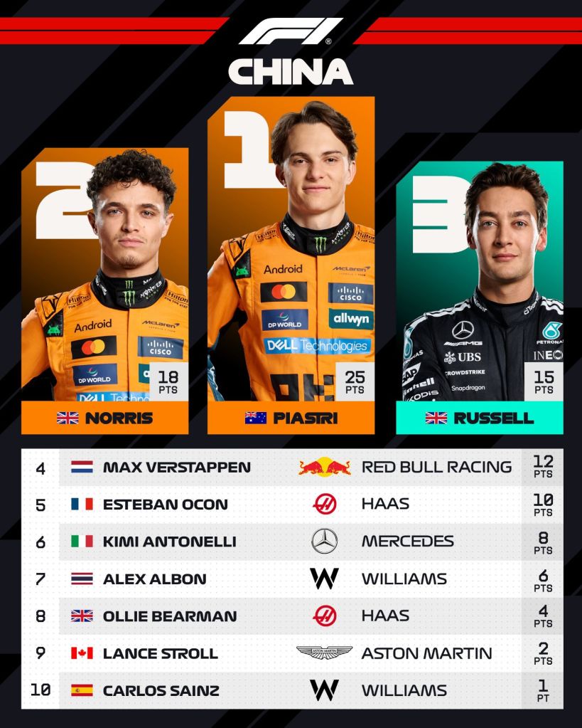 De ponta a ponta, Oscar Piastri venceu o GP da China nesta madrugada de sábado para domingo. Aliás, a McLaren dominou a prova, visto que Lando Norris,tirando um breve momento após a saída da parada do box, também foi 2º quase de ponta a ponta. Russell também não foi incomodado na terceira posição. Mesmo guiando uma carroça, Max Verstappen chegou na quarta colocação. As Ferraris de Hamilton e LeClerc, na pista, chegaram em quinto e sexto mas depois sofreram desclassificação.