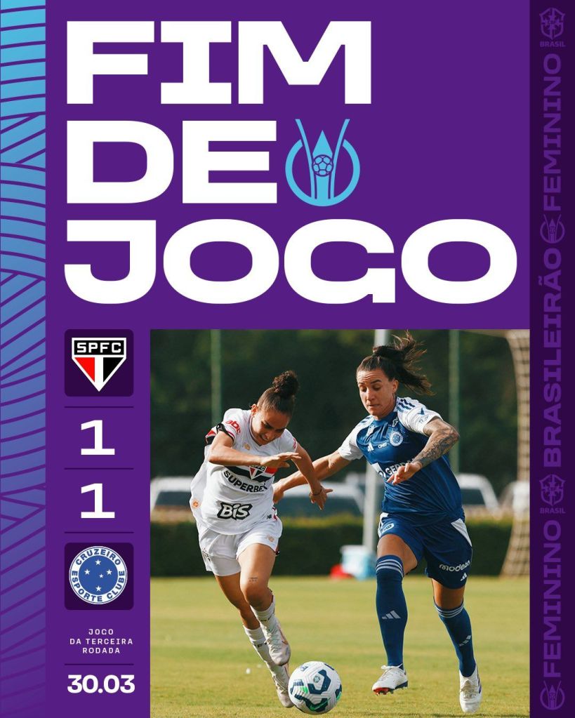 Em Cotia, um jogo disputadíssimo e empate entre Cruzeiro e São Paulo. Ambas equipes seguem invictas e jogando muito nesse início de Brasileirão.