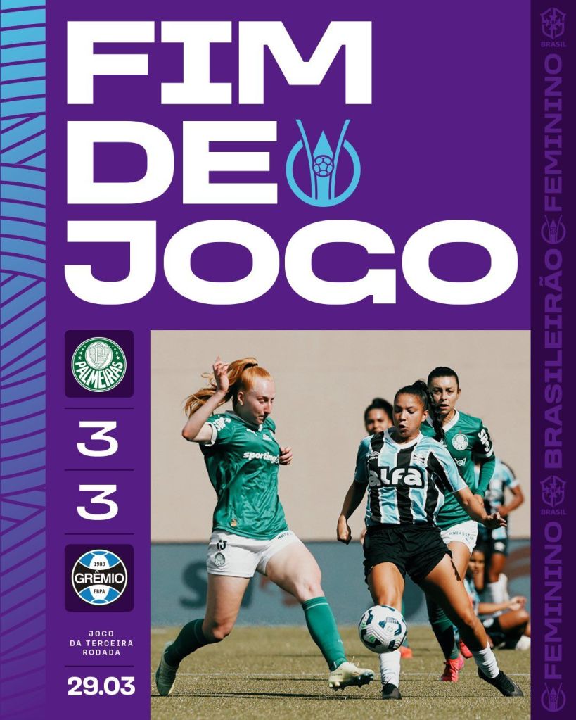 No único jogo de sábado, naArena Barueri, Palmeiras e Grêmio fizeram um jogo eletrizante, com um 3×3 sensacional! Entretanto, o empate for ruim para ambas equipes, quando o assunto é classificação. Amanda Gutierres segue se aproximando de Bia Zaneratto, Faltam 5 gols para superar a imperatriz tornar-se a maior artilheira da história do Palmeiras Feminino.