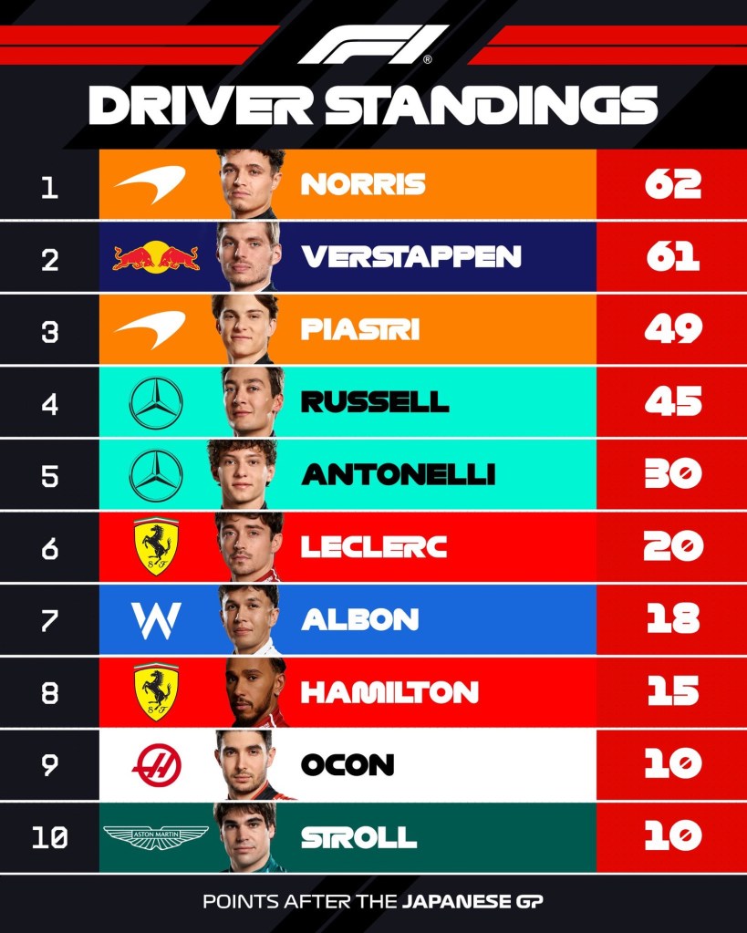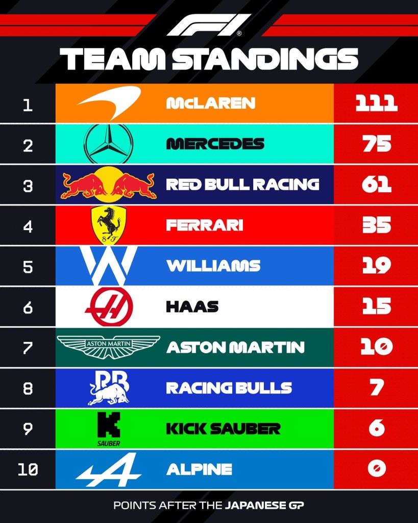 Versatappen provou, em Suzuka, porque é um tetracampeão mundial de Fórmula 1. Mesmo contra duas velozes McLaren, Norris e Piastri, conseguiu controlar a prova e vencer o GP nipônico de ponta à ponta. Norris passa a liderar o campeonato de pilotos apenas 1 ponto à frente do holandês. Na disputa por equipes, McLaren segue muito acima das demais. Aliás, segunda corrida seguida da McLaren com dois pilotos no pódio.