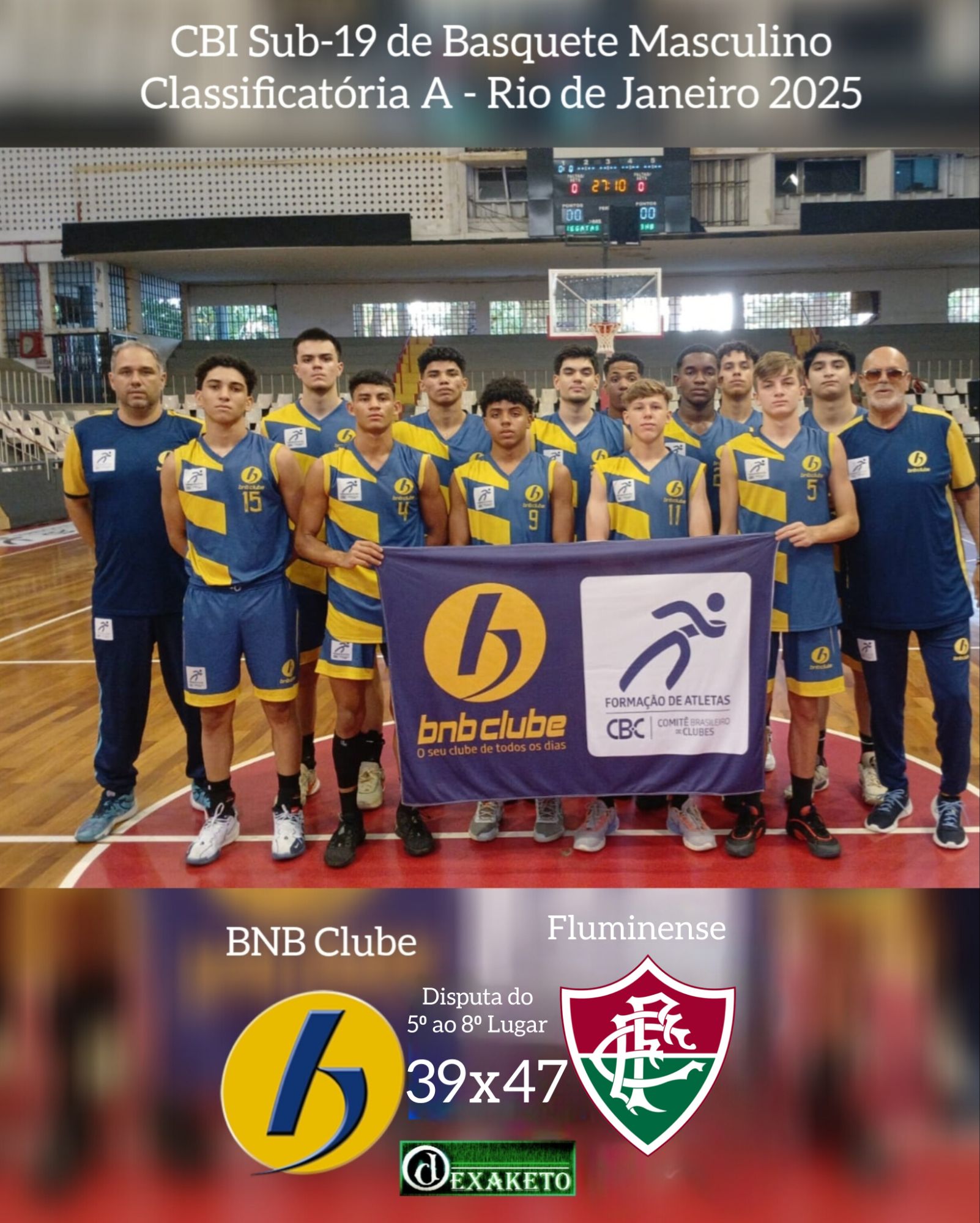 Em seu penúltimo jogo neste CBI Sub-19 de Basquete Masculino, que ocorre no Tijuca Tênis Clube, o BNB Clube acabou saindo derrotado pelo Fluminense, do Rio de Janeiro. O jogo era válido pela disputa de 5º ao 8º. A partida foi bastante equilibrada, e ambas equipes tiveram momentos de controle do jogo. O BNB Clube chegou a ter uma ótima vantagem de pontos no último período, porém a bola resolveu cair apenas para o lado carioca, nos minutos finais, resultando na vitória tricolor. Amanhã, o BNB Clube despede-se da competição diante o Paysandu, valendo a 7ª colocação do campeonato.