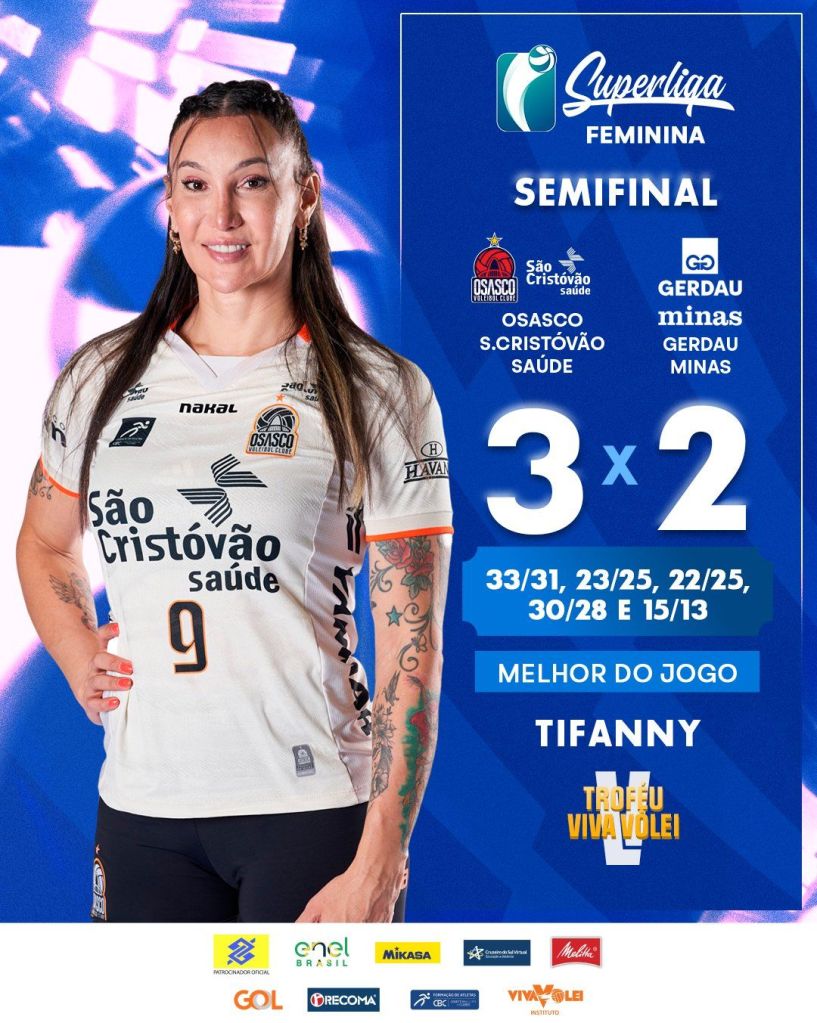 Depois do Minas conquistar uma vitória, aparentemente, tranquila no primeiro jogo, tivemos uma segunda partida de tirar o fôlego! Vimos, por exemplo, dois sets (o primeiro e o quarto) chegarem a casa dos 30 pontos. O Osasco foi guerreiro demais! Foi buscar uma virada épica no quarto set, onde chegou a estar perdendo por 18×12. O Minas queria muito encerrar a disputa hoje, e chegou a ver o placar do tie-break marcar 12×10, mas o Osasco, empurrado por um Liberatti ensurdecedor, conseguiu virar, como no quarto set, e sair com a vitória. Jogo impressionante de Tiffany (impressionantes 28 pontos) e Giovana, principalmente, no já tão citado 4⁰ set. Natália, que apesar de não ter sido a Natália de outros jogos, foi fundamental e decisiva, aliás, ela foi a autora do ponto que garantiu o triunfo paulista. Outro fator decisivo, a inversão do 5×1 nos instantes finais do último set. Poli e Kenya foram as responsáveis direta pela virada no tie-break.
