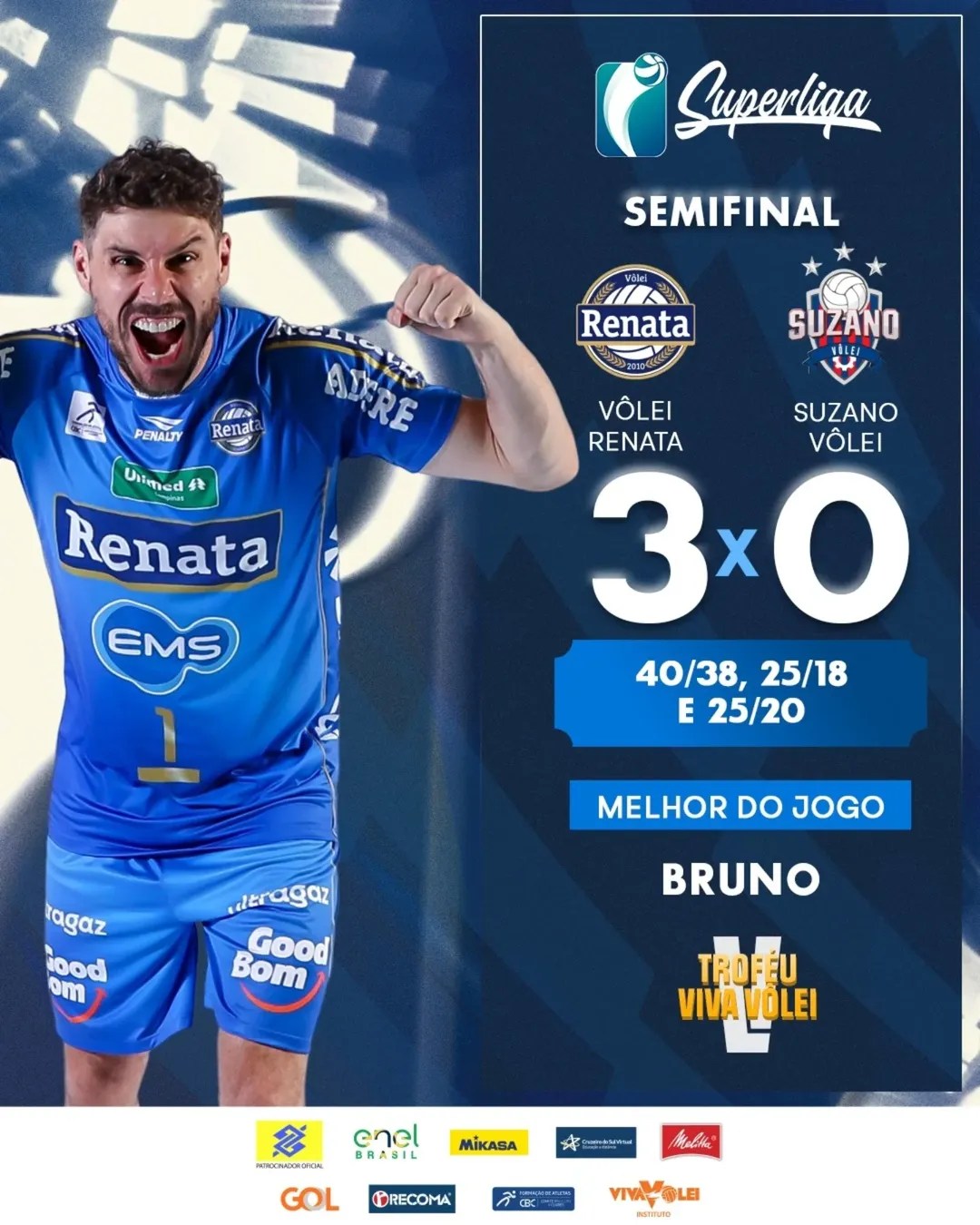Com direito a um primeiro set espetacular, definido na casa dos 40 pontos, o Vôlei Renata bateu o Suzano e está a uma vitória de sua segunda final consecutiva de Superliga Masculina. O Vôlei Renata precisou se superar e ir além da qualidade já conhecida da equipe. O Suzano mostrou que não foi à toa que eliminou o Minas, segundo na fase classificatória, nas Quartas. Entretanto, a qualidade do elenco do Vôlei Renata foi fundamental para a vitória do time de Campinas. Partidaça de Bruninho!