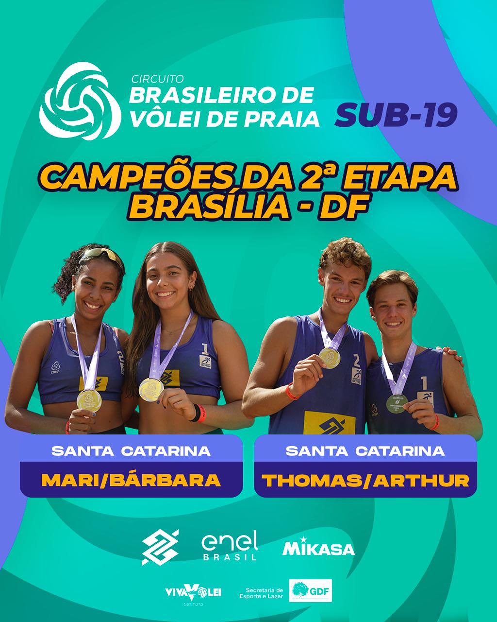 Santa Catarina dominou a etapa, conquistando uma dobradinha com Mari/Bárbara e Thomas/Arthur, ou seja, tanto no torneio masculino, quando no feminino, o vôlei catarinense saiu campeão da 2ª etapa do Circuito Brasileiro de Vôlei de Praia sub-19, em Brasília!