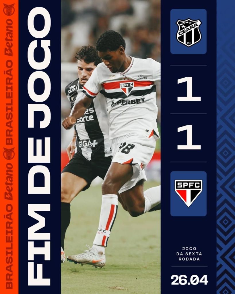 Na Arena Castelão, o Ceará quase venceu mais uma jogando em seus domínios, mais Rian Francisco não deixou e mais um empate envolvendo o São Paulo no campeonato, simplesmente o quinto em 6 jogos. Apesar de não vencer, o Ceará segue Invicto em casa.