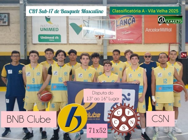 Em Vila Velha, a equipe do BNB Clube segue buscando melhores colocações na Classificatória A do CBI Sub-17 de Basquete Masculino. No confronto de hoje (9), os meninos do Campainha precisavam vencer para irem à disputa do 13º Lugar, e assim aconteceu.