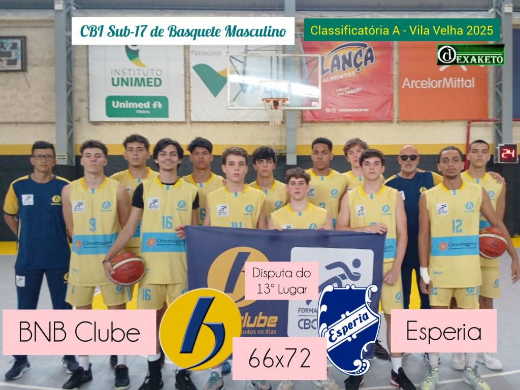 Pela disputa do 13⁰ lugar do CBI sub-17 de basquete masculino, em sua fase classificatória, sediada na cidade de Vila velha, no Espírito Santo, o BNB acabou superado pela equipe do Esperia, de São Paulo, em seu último jogo no torneio, e assim, encerrando a competição na 14ª colocação.